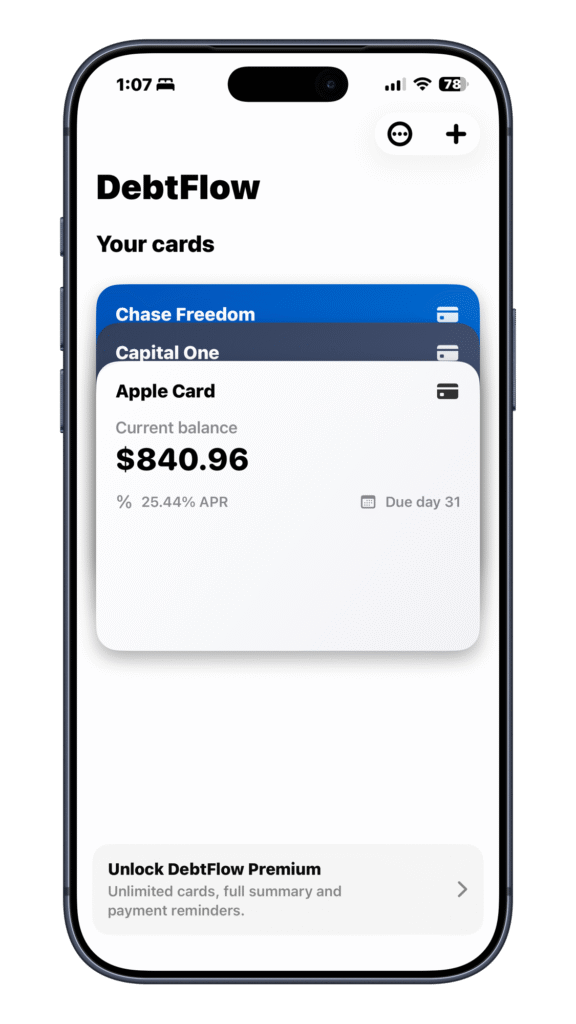 La app está pensada para que veas tus tarjetas como un flujo, no como números sueltos. Cada pago que haces tiene un impacto real, y DebtFlow te lo muestra de forma sencilla y directa.